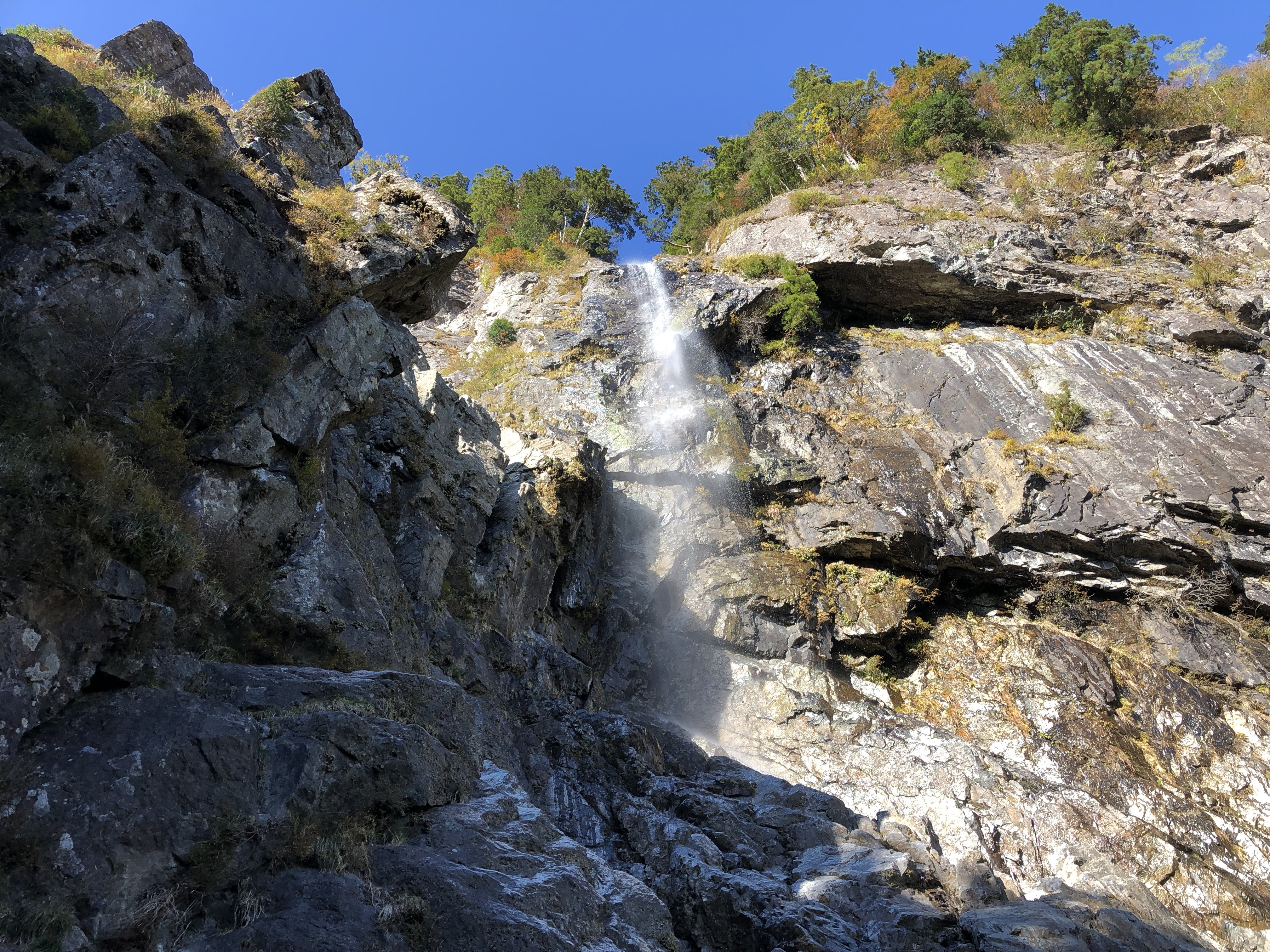前衛滝攻略すると、じゃーん、メインの八町滝のお出ましです。水量は少し少なめかもしれませんが、存在感ありますねー。ブルーの空との融和が素晴らしいです。