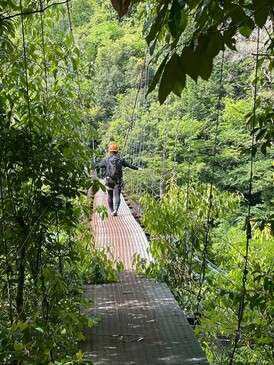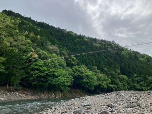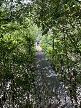 結構な長さと高さ。グーグルで調べたところ、長さ実測119m、神納川水面からは23mあるそうです。足元は金網製でスケスケ。下を流れる神納川がよく見えます。めっちゃ揺れる揺れる!怖い怖い~。ふるえる私をヨコに、jukuさんは橋の途中でジャンプしてるし、日比丸さんは動画撮ってるし、KM2さんは半ダッシュで渡ってるしで、やっぱりツワモノは違うなぁとしみじみ。
