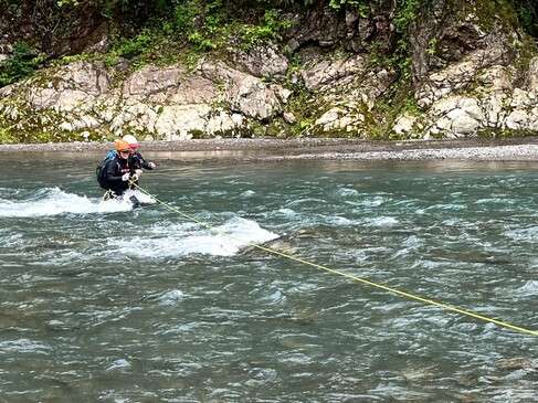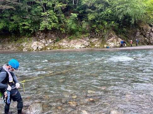 勢いよく日比丸さんが川へ入り、ロープを引っ張ってくださいます。しかし、見た目以上に流れが速く、水深もおしりくらいまでありそう。慌ててダダ星人さんがサポートに入り2人で。
