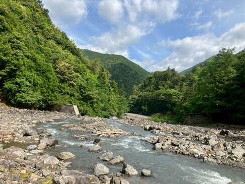 大きな河原で川幅も広く、周りを見ると大きな木の根っこが崖からまるまる見えていたり、山の側面が一面土色になっていたりで、両岸から谷が大きく切り崩されているのがわかります。