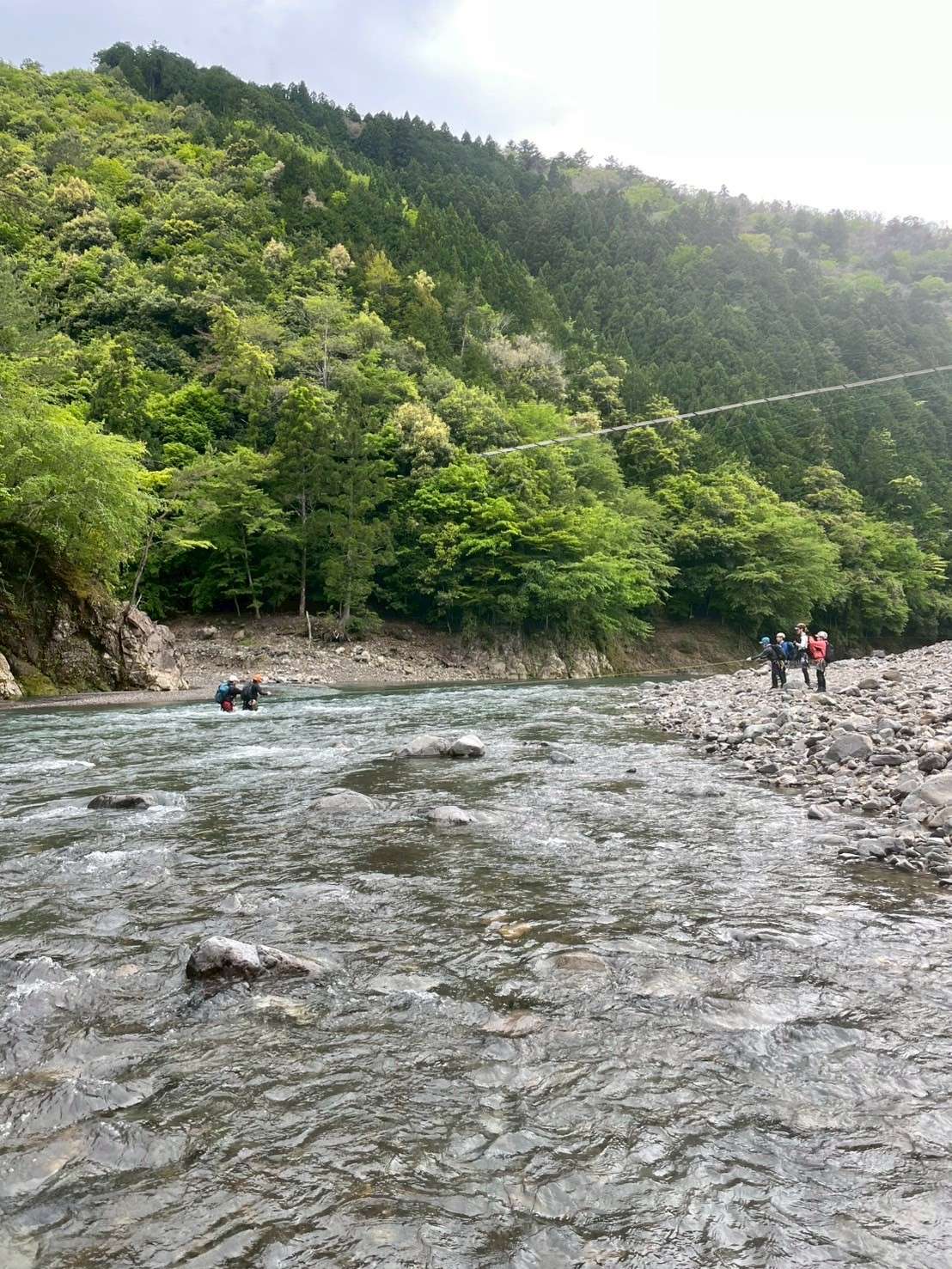 その後、jukuさんの投げロープが見事に決まり、再度両岸にロープが張られ、無事に渡渉再会。