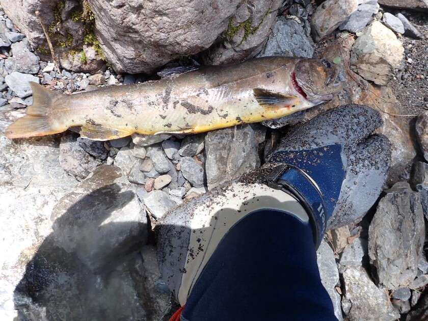 流れが強いので、岩陰にエサを粘り強く投げ込むとようやく釣れ始め、尺イワナもかかった。