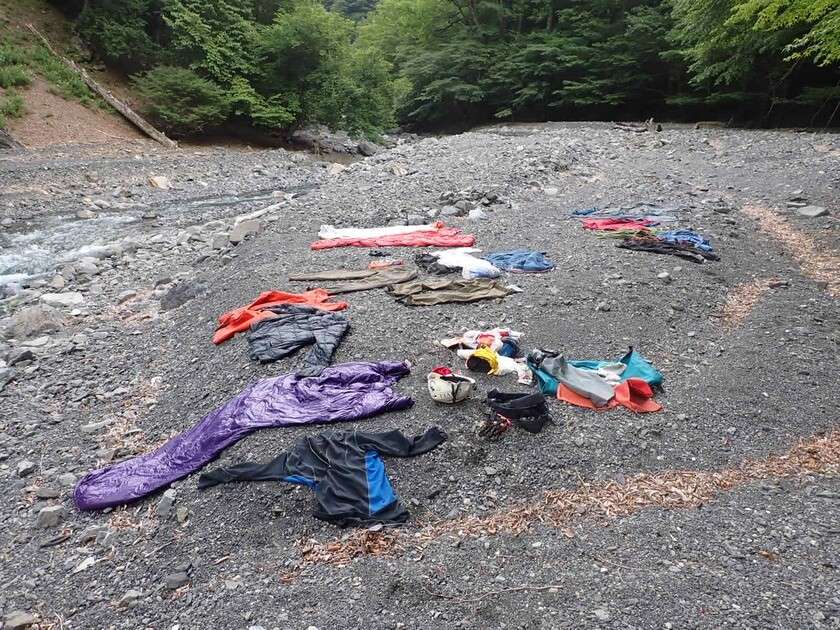 二股付近は平らで広い河原となっており、薪も大量に転がる天国のようなテン場で、太陽も顔を覗かせたので前夜に濡れてしまったものを乾かしつつ、薪を拾ったり、釣りに行ったりして休むことができた。ちなみにリンチョウ沢に魚影はなく、全く釣れなかった。