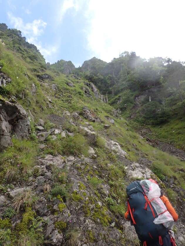 右岸尾根に乗り急登を上げていくが、池口岳付近の岩盤が立ちはだかる。斜度は45度程度で、私はヨレヨレゼーハー意識朦朧。コージさんは、カズレーサーさんと談笑しながら素晴らしいルーファイで、巧みに弱点を突き、池口岳南の尾根に乗り上げることができた。