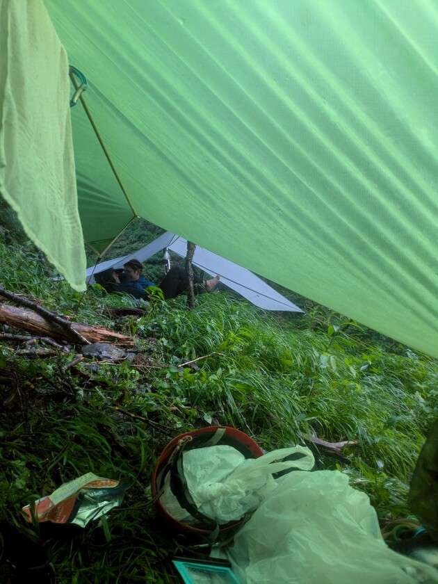 この日は夕方大雨の予報だったので急いでタープを張ったが、張り終えた頃に予報通り大雨となり、タープの下でやや、雨飛沫を浴びなら、棒ラーメンを食べたりして耐えることとなった。