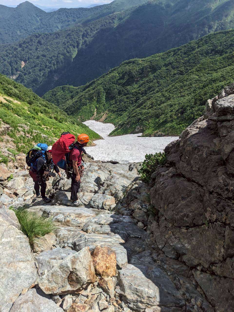 とはいえ、西側の大スラブの景色を楽しみながら、また、その付近にある険谷を遡行してきたシブ&コージさんの話を聞きながらの縦走はしんどいながらも楽しかった。
