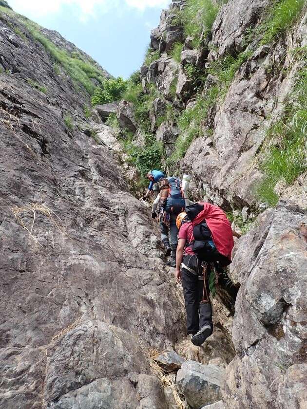 右股に入ってすぐに各自2~3Lの水を汲み、水浴びをしたり、たらふく水や行動食を口にした後は、いよいよ稜線への詰めに入る。