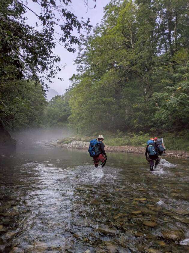 ちなみに装備はコージさんが上下ブラックメタリックスとウェット上着、ウェット半ズボン、シブさんが上下ブラックメタリックスとウェット上着、カズレーサーさんは上下ブラックメタリックスと上雨具、KM2は上ブラックメタリックスと下はモンベルウェットという装備で、箱淵は全員があまり寒さを覚えることなく通過出来た。