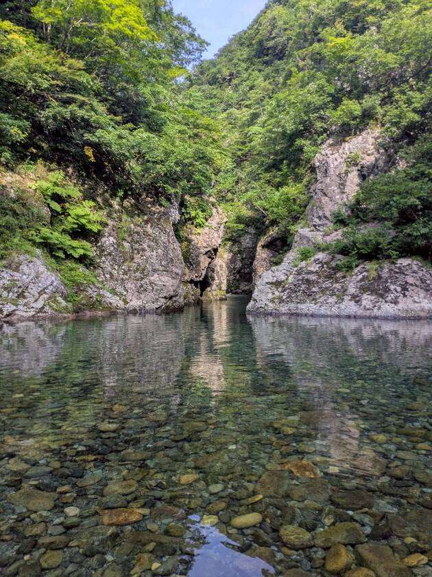 1時間ほど歩いて岩魚沢出合いを過ぎると沢は一気に狭まり、箱淵となる。