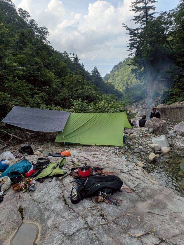2条の滝を右岸から、その先の滝を左岸からそれぞれ巻くと、シッカイ沢出合いに到着。平坦な河原に山のような焚き木があり、快適であった。