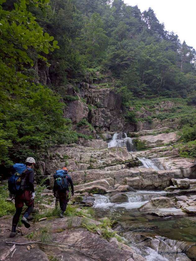 滝の右岸の端をよじ登ると、大きな階段状の幅広滝があり、沢幅も広がり、美しい。でも内心、いつ雪渓やスノーブロックが出るのか、ヒヤヒヤしながらの溯行となる。