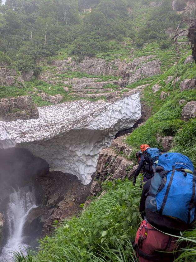 スノーブロックや雪渓は、川の端が分厚く、川の中央は薄くなっていること、上流と下流の末端はそれぞれ薄くなっていること、など、歩き方についていろいろとシブ&コージさんに教わることができて、とても勉強になった。