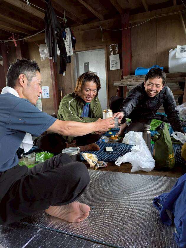 避難小屋内は快適で、難局を乗り越えたことを祝って宴会。