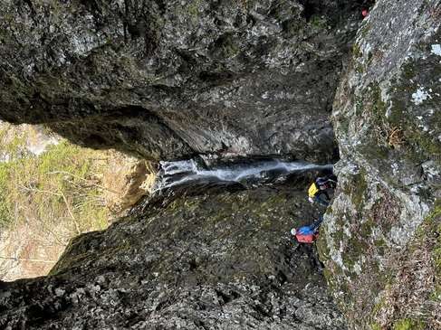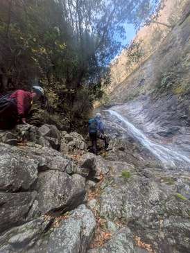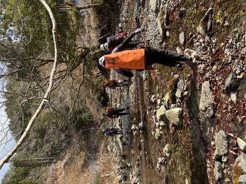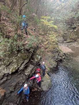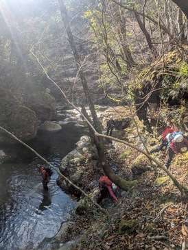 皆さんリード出来るかたばかりなので、右岸の岸壁を登るか、右岸の高巻きをするか、意見交換されていましたが、私自身はどちらもかなり厳しそうに感じて、素直に怖いですと伝えました。