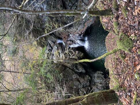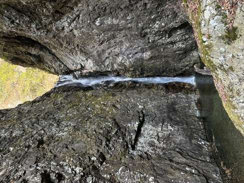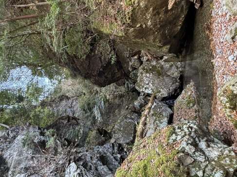手前からだと水が落ちている釜が見えません。急いで雌滝の前の大岩に登ると、真下にちゃんと見えました。