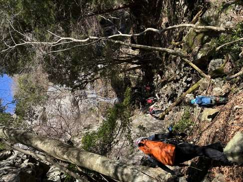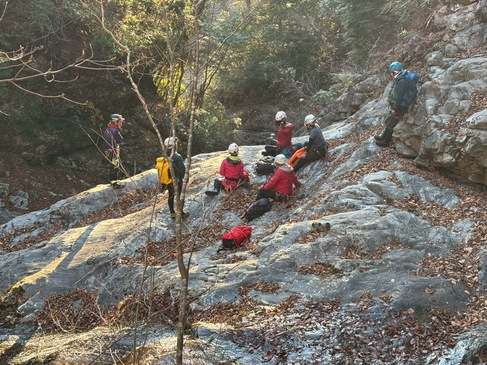 後のメンバーを待つ間、落ち口から水線を移動して日当たりの良いナメの岩の上に行きました。