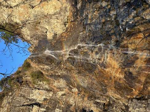 西の稜線に乗っかるようなオレンジの夕陽に照らされて、虹のかかった迷滝が輝いていました。